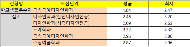 < 수시 학교생활우수자 및 실기 전형 1단계 합격자 성적 현황 입니다. >