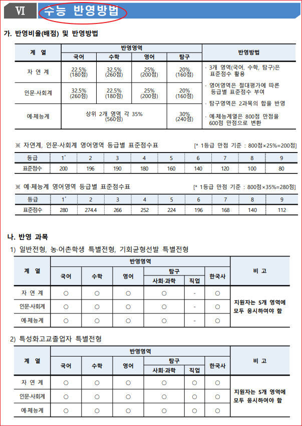 수능 반영방법 입니다.